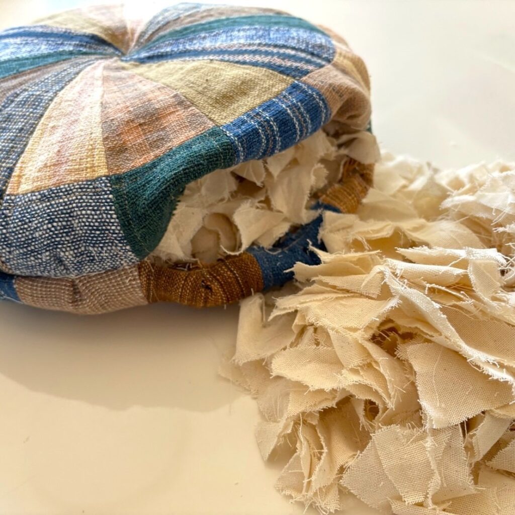 実は、中に入っているのは買ってきたワタではなく…機械織りのコットン生地を、細かく割いたもので少し重さがある存在感がまたいいんです!