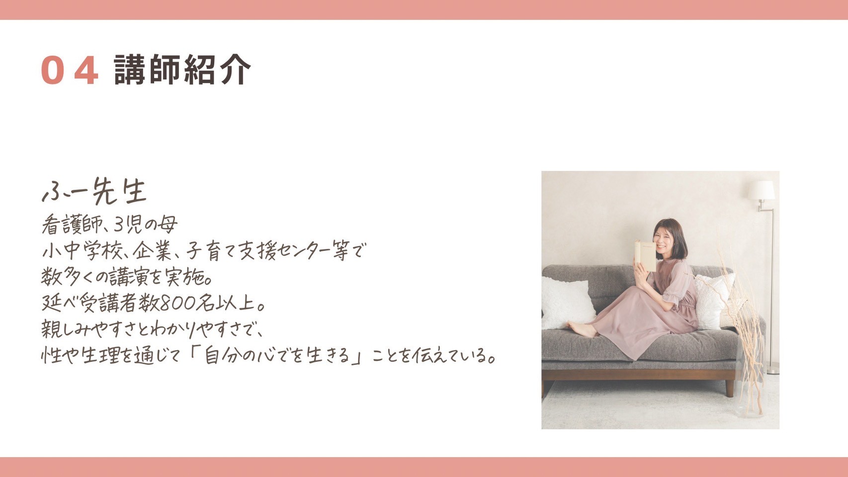 ふー先生 看護師、3児の母 小中学校、企業、子育て支援センター等で数多くの講演を実施。延べ受講者数900名以上。