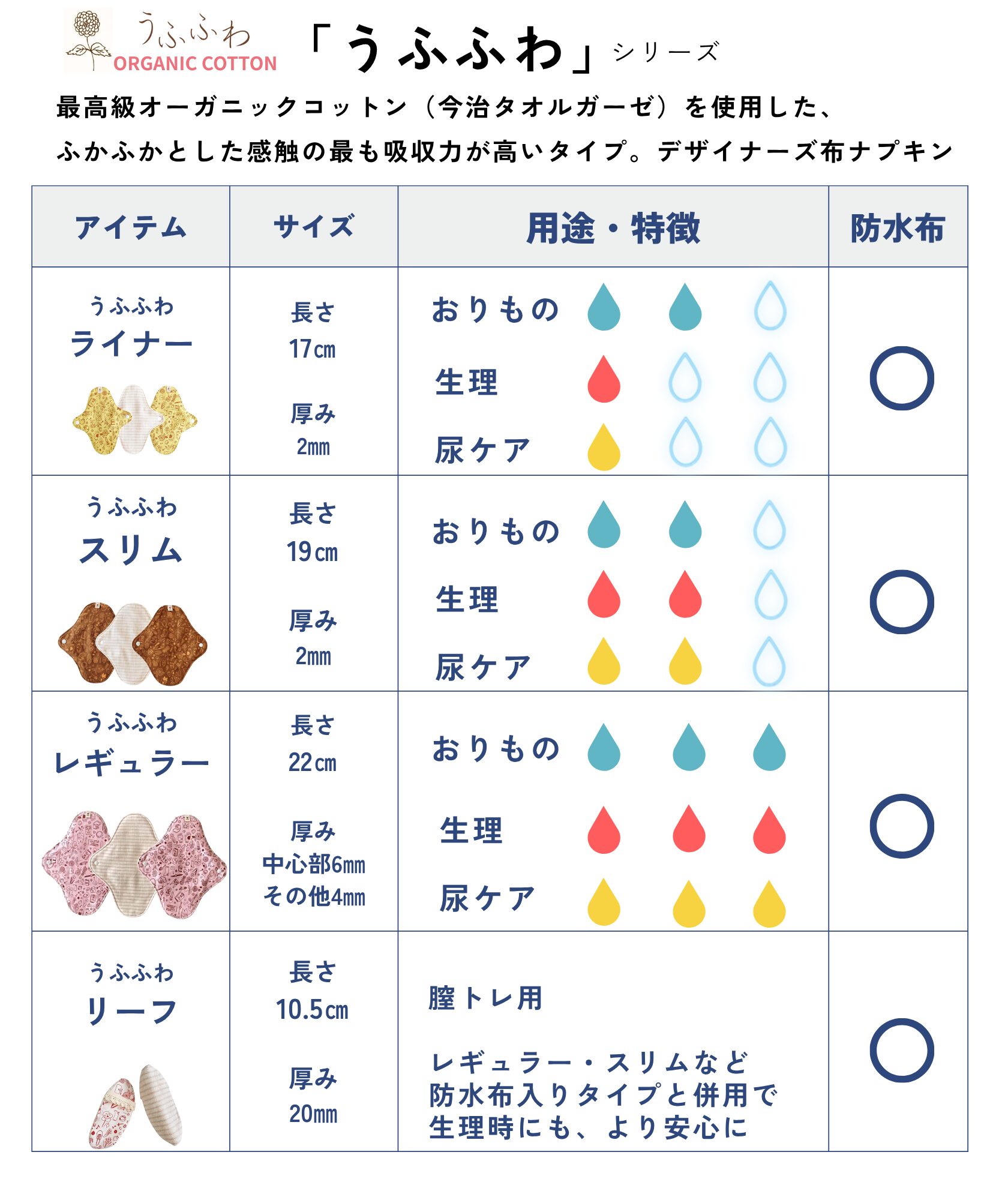 防水布入りの布ナプキンは、浸透して漏れる心配はありません。心配であれば、生理時以外のおりもの時や生理の終りがけ、冷え対策でご使用されてみてください。