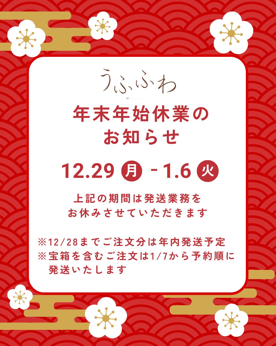 12月29日~1月6日までの期間は、発送をお休みさせていただきます。